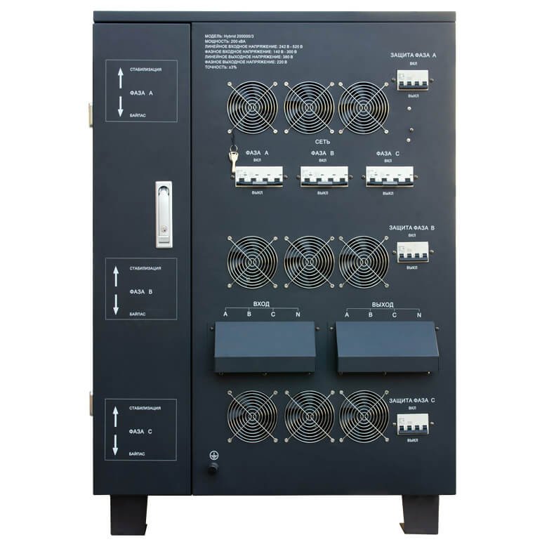 Мощный стабилизатор напряжения Энергия Hybrid 200000/3 предназначен для работы промышленных трехфазных электросетях.