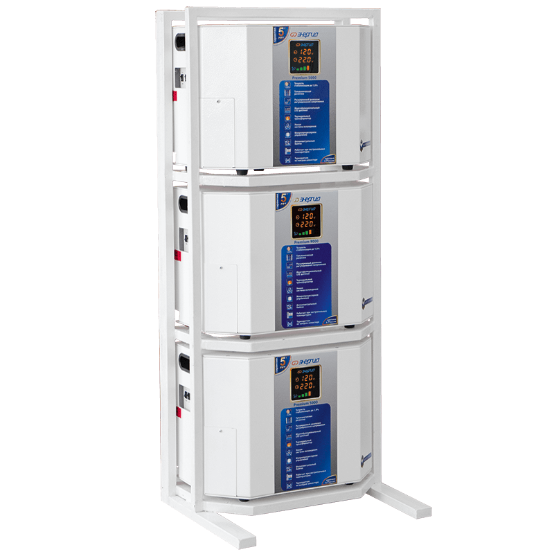 Энергия Premium мощностью 5, 7.5, 9 и 12кВА к трехфазной сети. Стойка максимально адаптирована к данным стабилизаторам по размерам и дизайну.