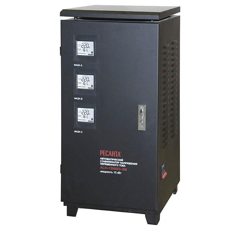 Стабилизатор напряжения Ресанта АСН-15000/3-ЭМ предназначен для работы в бытовых и промышленных трехфазных электросетях.