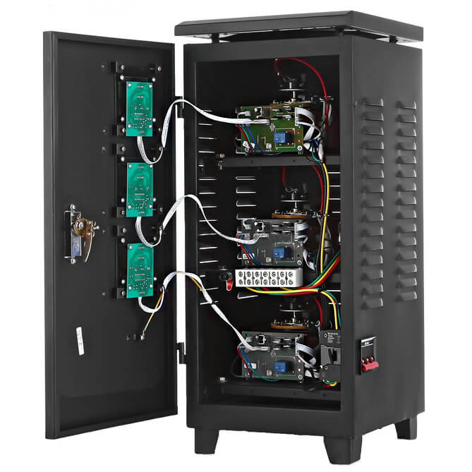 Стабилизатор автоматически поддерживает постоянный уровень напряжения, защищая от скачков, просадок, перекоса фаз,