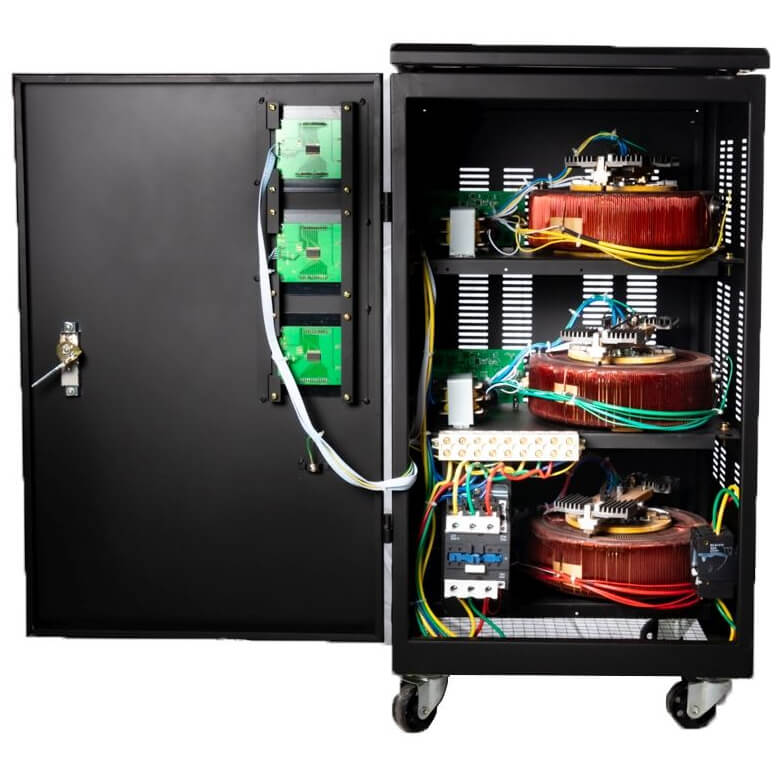 Стабилизатор автоматически поддерживает постоянный уровень напряжения, защищая от скачков, просадок, перекоса фаз,