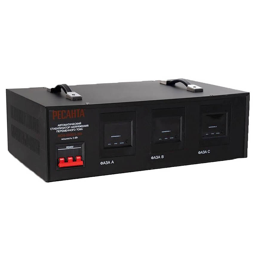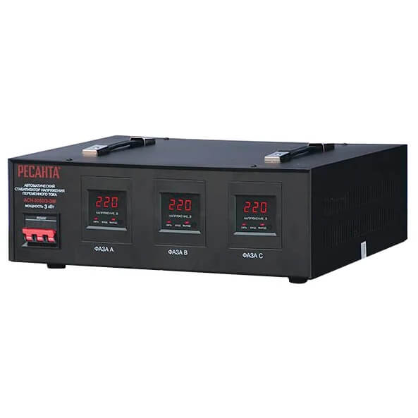 Стабилизатор напряжения Ресанта АСН-3000/3-ЭМ предназначен для работы в бытовых и промышленных трехфазных электросетях.