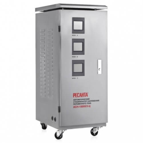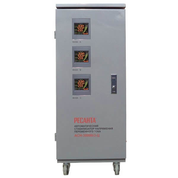 Недорогой трехфазный стабилизатор напряжения Ресанта АСН-30000/3-Ц применяется для нейтрализации скачков и просадок напряжения
