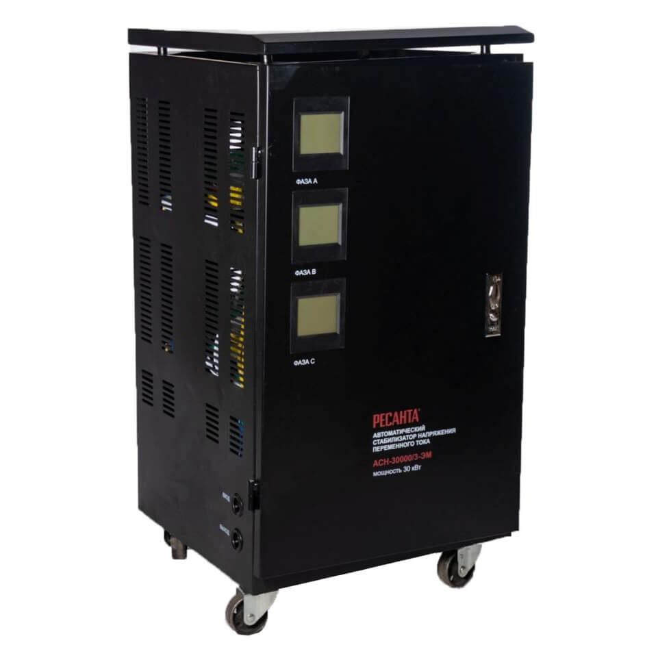 Стабилизатор напряжения Ресанта АСН-30000/3-ЭМ предназначен для работы в бытовых и промышленных трехфазных электросетях.