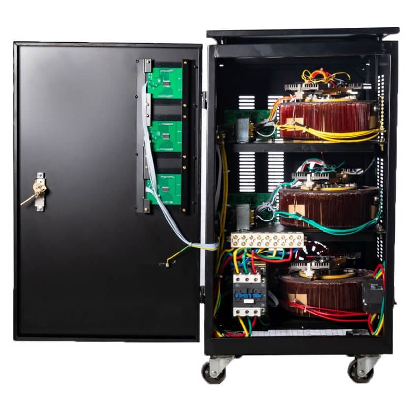 Стабилизатор автоматически поддерживает постоянный уровень напряжения, защищая от скачков, просадок, перекоса фаз,