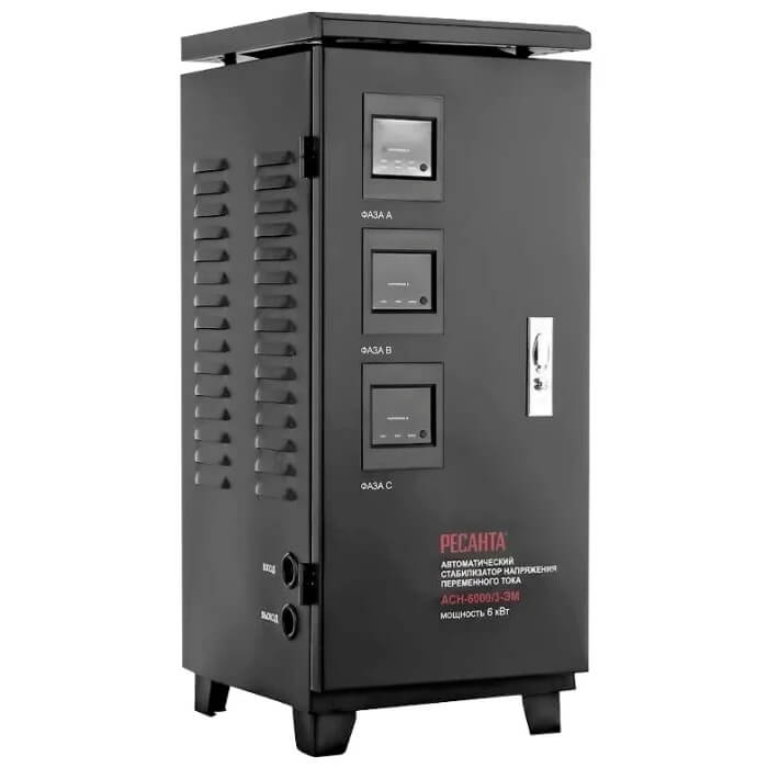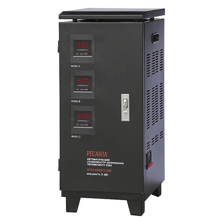 Стабилизатор напряжения Ресанта АСН-6000/3-ЭМ предназначен для работы в бытовых и промышленных трехфазных электросетях.