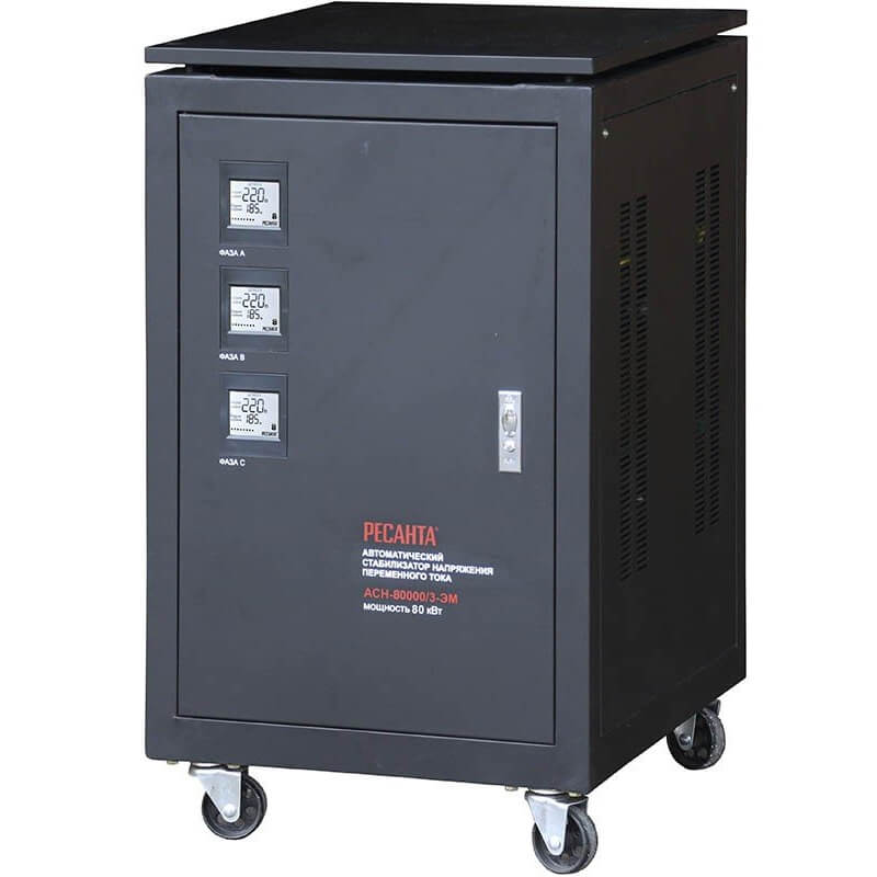 Стабилизатор напряжения Ресанта АСН-80000/3-ЭМ предназначен для работы в бытовых и промышленных трехфазных электросетях.