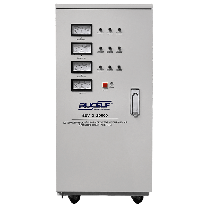 Недорогой трехфазный стабилизатор напряжения Rucelf SDV-3-20000 применяется для нейтрализации просадок и скачков напряжения